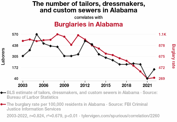 User prompt: Please provide potential search keywords for a paper titled Sew Many Burglaries: Unraveling the Connection Between Tailors and Burglaries in Alabama with an abstract of This study aims to examine the intriguing relationship between the number of tailors, dressmakers, and custom sewers in Alabama and the incidence of burglaries in the state. Leveraging data from the Bureau of Labor Statistics and the FBI Criminal Justice Information Services, we endeavored to stitch together insights into this seemingly disparate pairing. Our findings revealed a significant correlation coefficient of 0.8237858 and p < 0.01 for the period spanning from 2003 to 2022.