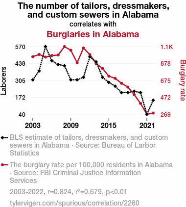 - The spurious research paper: Sew Many Burglaries: Unraveling the Connection Between Tailors and Burglaries in Alabama