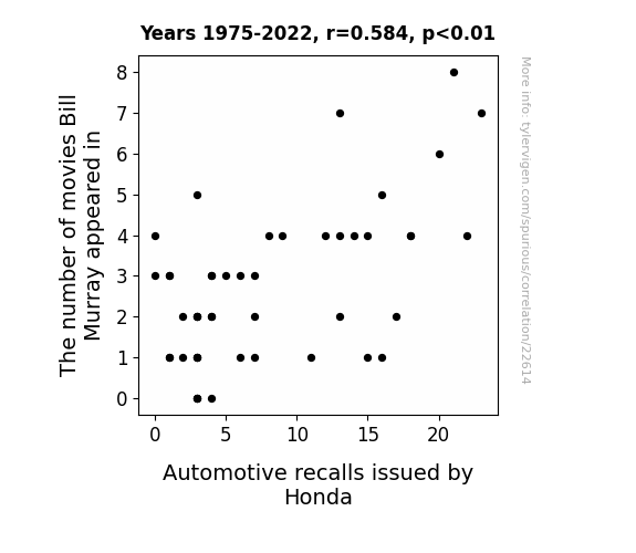 This means 34.2% of the change in the one variable (i.e., Automotive recalls issued by Honda) is predictable based on the change in the other (i.e., The number of movies Bill Murray appeared in) over the 48 years from 1975 through 2022.