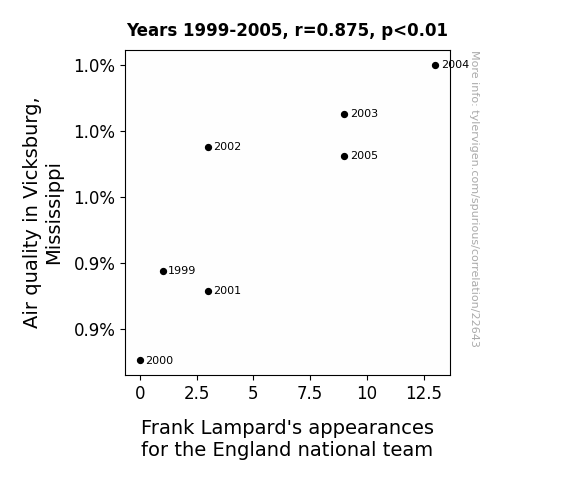 This means 76.6% of the change in the one variable (i.e., Frank Lampard's appearances for the England national team) is predictable based on the change in the other (i.e., Air quality in Vicksburg, Mississippi) over the 7 years from 1999 through 2005.