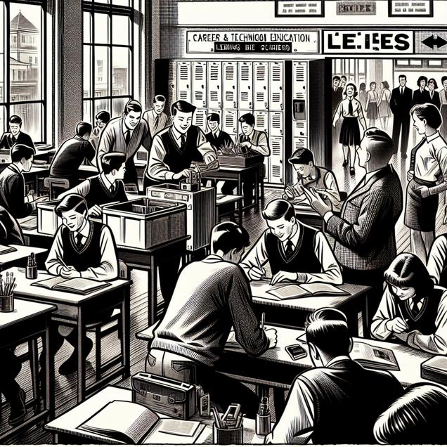 ChatGPT: Generate an image of a bustling high school career/technical education classroom in a classic black-and-white newspaper illustration style. The room should be filled with eager students, while the name "Lee" appears on multiple lockers in the hallways. The career/technical education teacher, also named Lee, should be depicted as popular and well-liked among the students, who are excitedly engaged in hands-on learning activities. Capture the lively yet orderly atmosphere of the classroom and hallway within the simple black-and-white illustration.