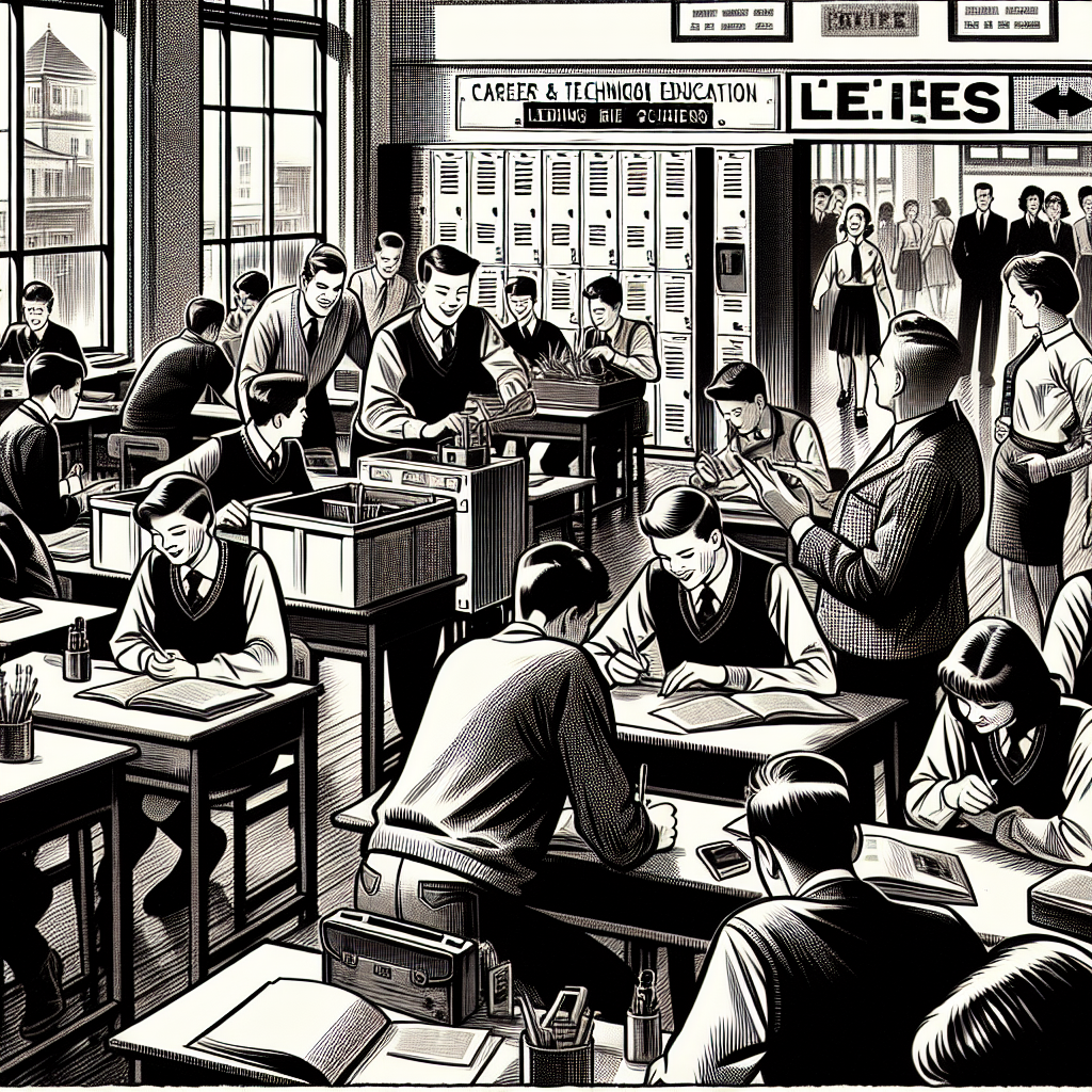 Prompt: Generate an image of a bustling high school career/technical education classroom in a classic black-and-white newspaper illustration style. The room should be filled with eager students, while the name "Lee" appears on multiple lockers in the hallways. The career/technical education teacher, also named Lee, should be depicted as popular and well-liked among the students, who are excitedly engaged in hands-on learning activities. Capture the lively yet orderly atmosphere of the classroom and hallway within the simple black-and-white illustration. The depiction should include only scenes, people, and objects, it should not include text or speech bubbles.