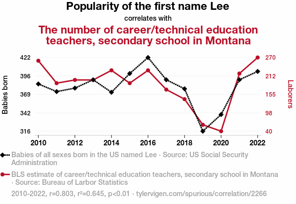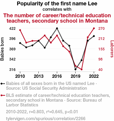 User prompt: Please provide potential search keywords for a paper titled Leewhat? The Curious Case of Lee: A Statistical Analysis of Its Effects on Career/Technical Education Teachers in Montana Secondary Schools with an abstract of This paper presents a quantitative analysis of the relationship between the popularity of the first name Lee and the number of career/technical education teachers in secondary schools across the state of Montana. Leveraging data from the US Social Security Administration and the Bureau of Labor Statistics, our research team set out to uncover any potential connections between the prevalence of the name Lee and the presence of educators in the vocational education domain. Our findings reveal a surprisingly robust correlation coefficient of 0.8031790 and a statistically significant p-value of less than 0.01 for the period spanning from 2010 to 2022. The implications of these results are both intriguing and, dare we say, "Lee-thal." We delve into the implications of these findings and offer some lighthearted speculations on the potential impact of names on career choices, all while maintaining a serious academic tone, of course.