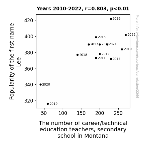 This paper presents a quantitative analysis of the relationship between the popularity of the first name Lee and the number of career/technical education teachers in secondary schools across the state of Montana. Leveraging data from the US Social Security Administration and the Bureau of Labor Statistics, our research team set out to uncover any potential connections between the prevalence of the name Lee and the presence of educators in the vocational education domain. Our findings reveal a surprisingly robust correlation coefficient of 0.8031790 and a statistically significant p-value of less than 0.01 for the period spanning from 2010 to 2022. The implications of these results are both intriguing and, dare we say, "Lee-thal." We delve into the implications of these findings and offer some lighthearted speculations on the potential impact of names on career choices, all while maintaining a serious academic tone, of course.