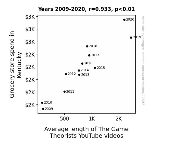 This means 87.1% of the change in the one variable (i.e., Average length of The Game Theorists YouTube videos) is predictable based on the change in the other (i.e., Grocery store spend in Kentucky) over the 12 years from 2009 through 2020.