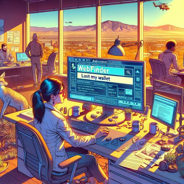 ChatGPT: In a sunny office in Albuquerque, a zoologist is answering emails and researching wildlife on their computer. On the desk, there is an open browser with a Google search for "lost my wallet" on the screen. Just outside the window, a few colleagues are discussing their latest field work in the beautiful New Mexico landscape.