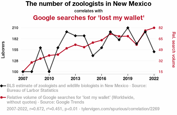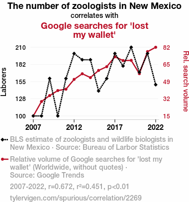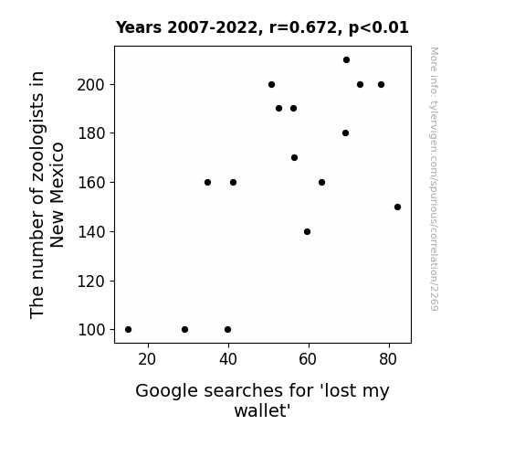 User prompt: Please provide potential search keywords for a paper titled The Zoologist-Zoinks Connection: Uncovering the Wallet-Wildlife Correlation in New Mexico with an abstract of This paper delves into the peculiar relationship between the number of zoologists in New Mexico and Google searches for "lost my wallet". Utilizing data from the Bureau of Labor Statistics and Google Trends, our research team embarked on a mission to unravel this enigmatic connection. The findings unveiled a correlation coefficient of 0.6716816 and p < 0.01 for the years spanning 2007 to 2022, shedding light on this uncanny correlation.