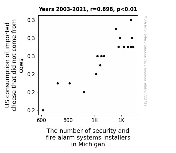 This means 80.6% of the change in the one variable (i.e., The number of security and fire alarm systems installers in Michigan) is predictable based on the change in the other (i.e., US consumption of imported cheese that did not come from cows) over the 19 years from 2003 through 2021.