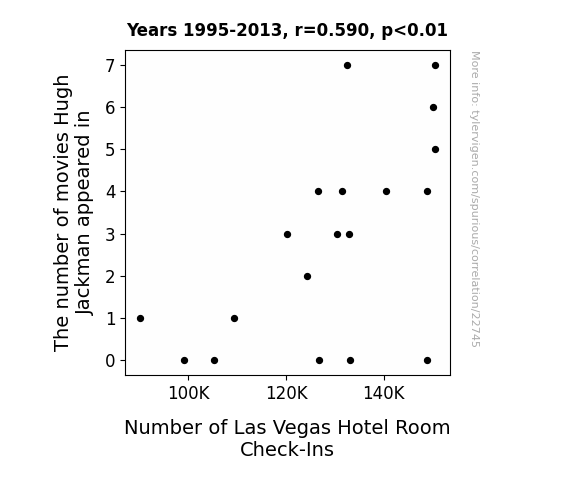 This means 34.8% of the change in the one variable (i.e., Number of Las Vegas Hotel Room Check-Ins) is predictable based on the change in the other (i.e., The number of movies Hugh Jackman appeared in) over the 19 years from 1995 through 2013.