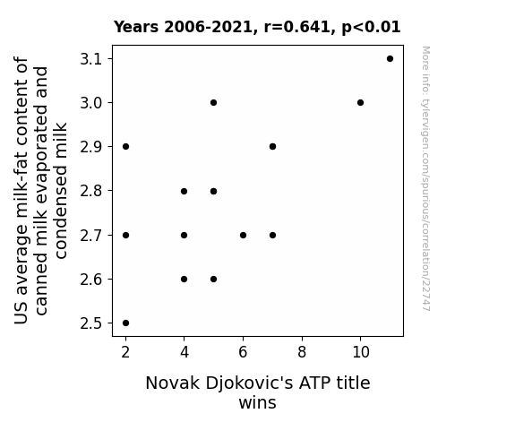 This means 41.1% of the change in the one variable (i.e., Novak Djokovic's ATP title wins) is predictable based on the change in the other (i.e., US average milk-fat content of canned milk evaporated and condensed milk) over the 16 years from 2006 through 2021.