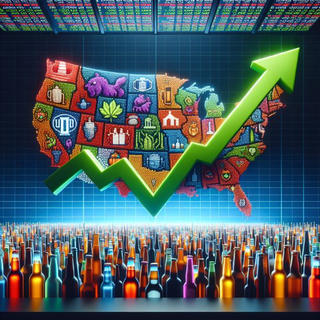 Prompt: Generate an image of a realistic scene featuring the United States map as the background, filled with colorful brewery icons scattered across the country. In the foreground, display a stock market ticker showing PACCAR's stock price rising steadily, with a green upward arrow indicating its positive trajectory. The breweries should be vibrant and distinct, while the stock market ticker should be clear and easily legible. Ensure that the overall visual depiction is simple yet enticing. The depiction should include only scenes, people, and objects, it should not include text or speech bubbles.