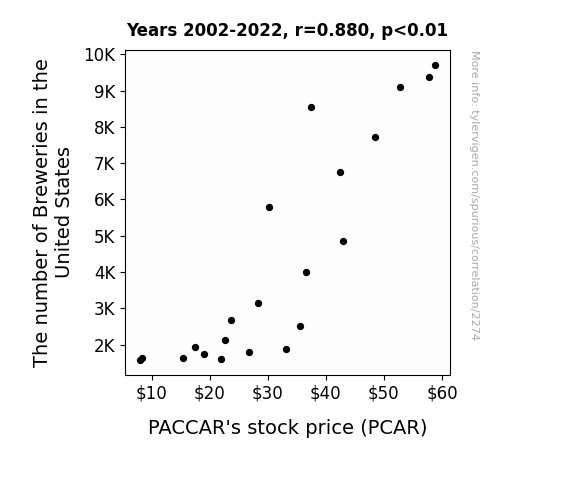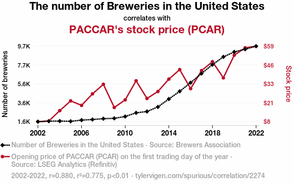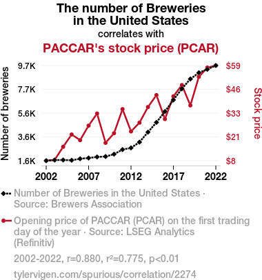 - The spurious research paper: Pour Decisions: Exploring the Sudsy Connection Between the Number of Breweries in the United States and PACCAR's Stock Price