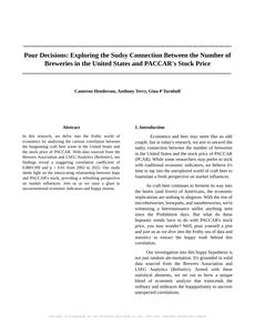 User prompt: Please provide potential search keywords for a paper titled Pour Decisions: Exploring the Sudsy Connection Between the Number of Breweries in the United States and PACCAR's Stock Price with an abstract of In this research, we delve into the frothy world of economics by analyzing the curious correlation between the burgeoning craft beer scene in the United States and the stock price of PACCAR. With data sourced from the Brewers Association and LSEG Analytics (Refinitiv), our findings reveal a staggering correlation coefficient of 0.8801309 and p < 0.01 from 2002 to 2022. Our study sheds light on the intoxicating relationship between hops and PACCAR's stock, providing a refreshing perspective on market influences. Join us as we raise a glass to unconventional economic indicators and hoppy returns.