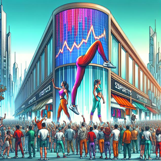 ChatGPT: Create a vibrant image of a high-tech cityscape where a large crowd of people are gathered outside a Lululemon store, with the store's sleek, modern design standing out against the surrounding buildings. The scene is alive with excitement as the crowd of enthusiastic shoppers eagerly discuss the latest yoga pants and athletic wear, while a group of friends all named Stevie happily compare their purchases. The stock ticker outside the store prominently displays Lululemon's surging stock price, reflecting the brand's popularity and success in a visually captivating manner.