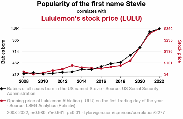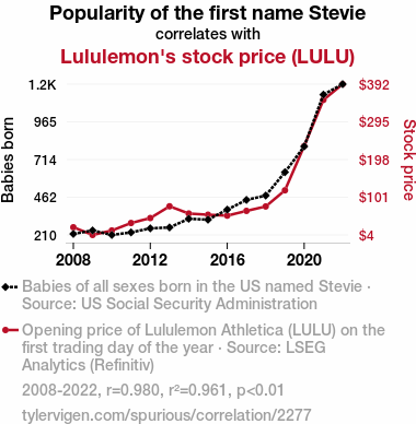 Lululemon Athletica Inc., Stevie, stock price, correlation, statistical study, market dynamics, US Social Security Administration data, LSEG Analytics, Refinitiv, market behavior, stock market performance, name "Stevie", nomenclature, whimsical correlation, mirthful dynamics