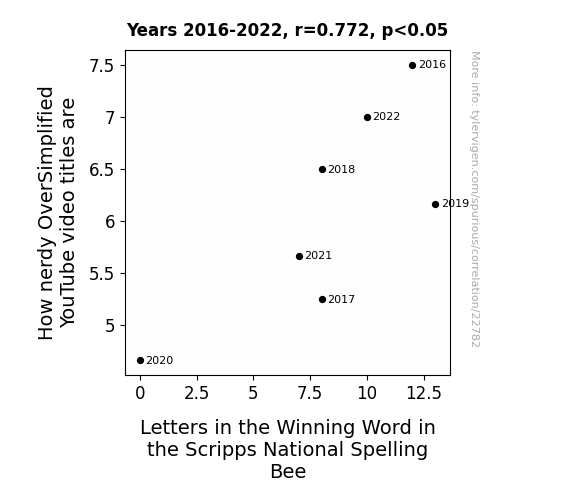 This means 59.6% of the change in the one variable (i.e., Letters in the Winning Word in the Scripps National Spelling Bee) is predictable based on the change in the other (i.e., How nerdy OverSimplified YouTube video titles are) over the 7 years from 2016 through 2022.