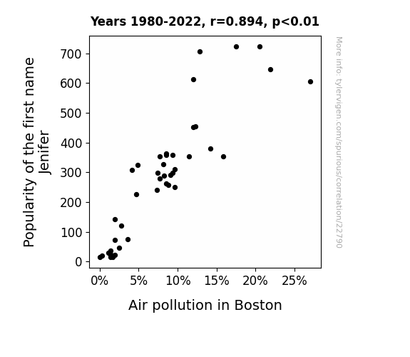 This means 80% of the change in the one variable (i.e., Air pollution in Boston) is predictable based on the change in the other (i.e., Popularity of the first name Jenifer) over the 43 years from 1980 through 2022.