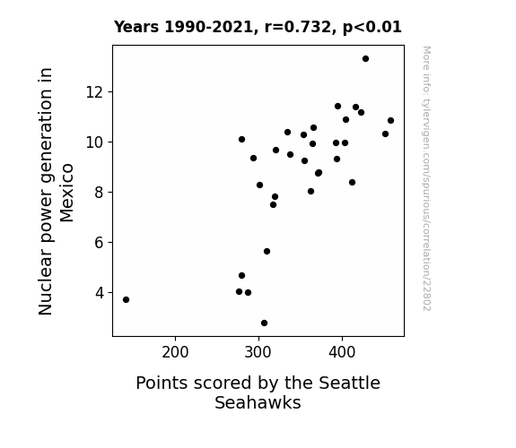 This means 53.5% of the change in the one variable (i.e., Points scored by the Seattle Seahawks) is predictable based on the change in the other (i.e., Nuclear power generation in Mexico) over the 32 years from 1990 through 2021.