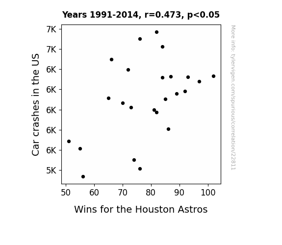 This means 22.3% of the change in the one variable (i.e., Wins for the Houston Astros) is predictable based on the change in the other (i.e., Car crashes in the US) over the 24 years from 1991 through 2014.