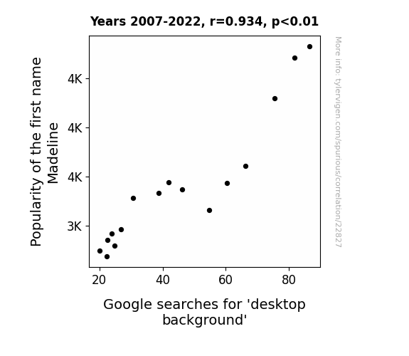 This means 87.2% of the change in the one variable (i.e., Google searches for 'desktop background') is predictable based on the change in the other (i.e., Popularity of the first name Madeline) over the 16 years from 2007 through 2022.