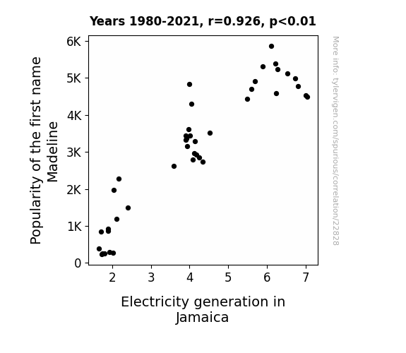 This means 85.8% of the change in the one variable (i.e., Electricity generation in Jamaica) is predictable based on the change in the other (i.e., Popularity of the first name Madeline) over the 42 years from 1980 through 2021.