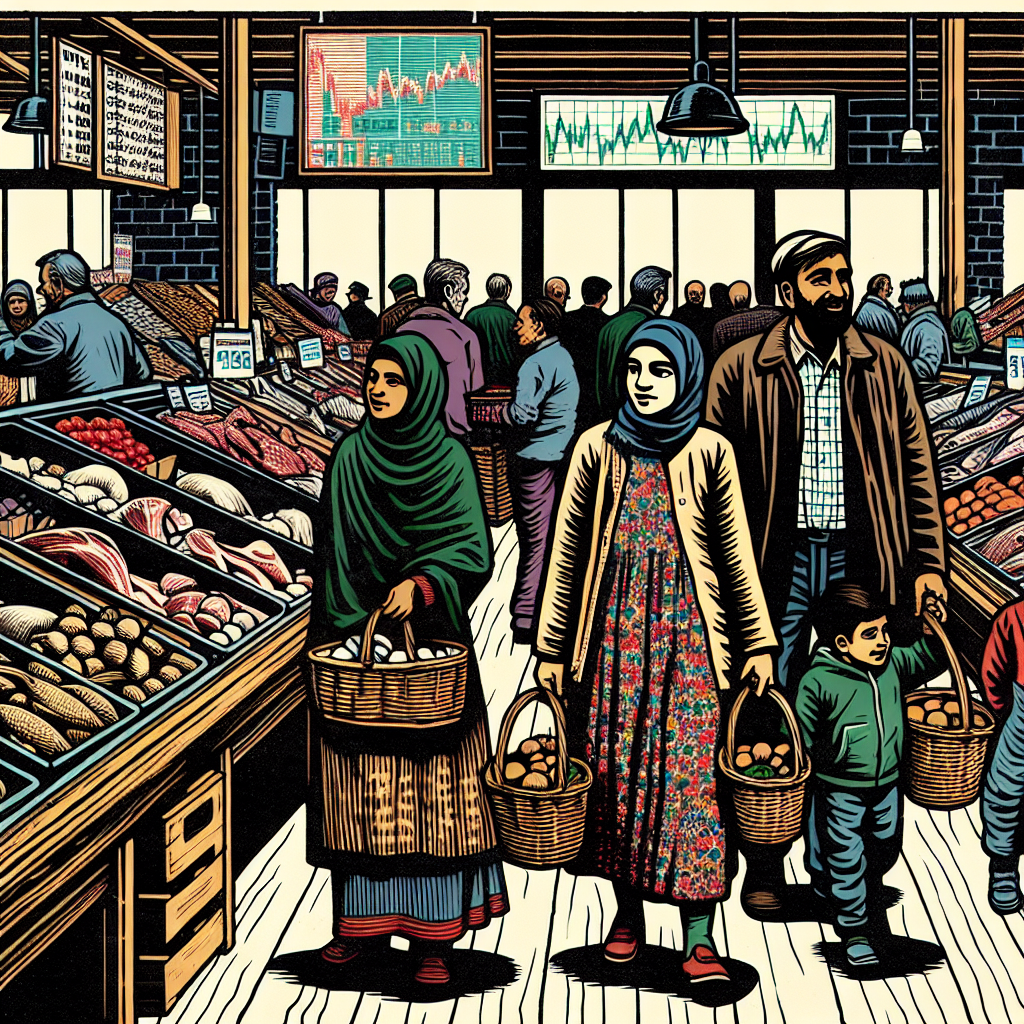 Prompt: Generate a woodblock painting depicting a family at a bustling grocery store. The family members are each carrying a basket filled with an array of meats, poultry, fish, and eggs. The shelves are abundantly stocked with fresh produce, and the air is filled with the sound of chatter. In the background, a large stock market display shows ANSYs' stock price steadily climbing. The woodblock style should emphasize bold shapes and vibrant colors to capture the lively atmosphere of the grocery store. The depiction should include only scenes, people, and objects, it should not include text or speech bubbles.