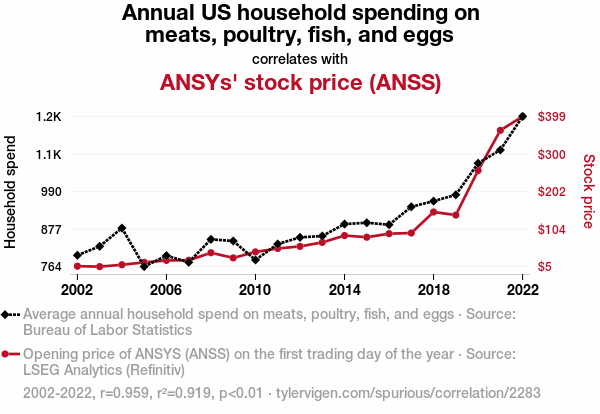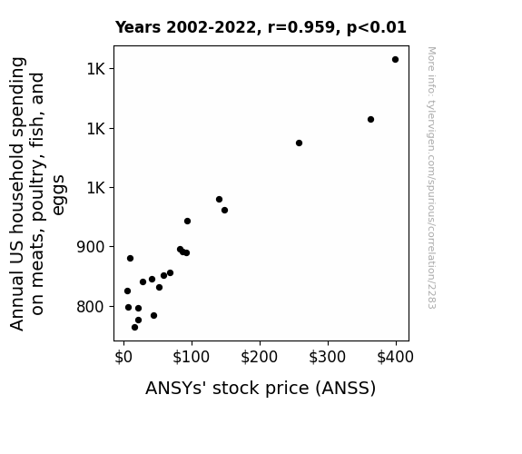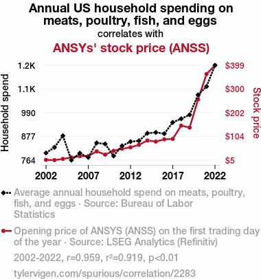 - The spurious research paper: Meating Expectations: A Correlation Study of Annual US Household Spending on Meats, Poultry, Fish, and Eggs and ANSYs' Stock Price