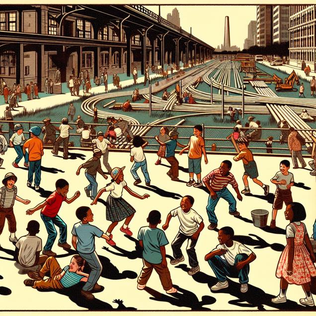 Prompt: Generate an image of a busy school playground in the United States, filled with energetic kids playing and laughing. Also, showcase a construction site in North Dakota, where several workers are seen laying pipes in the background. Render the scene using the style of a woodblock painting, focusing on the vibrant, lively atmosphere of the playground and the industrious activity at the construction site. The depiction should include only scenes, people, and objects, it should not include text or speech bubbles.