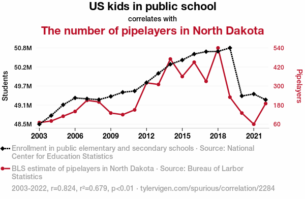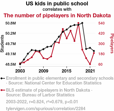 This means 67.9% of the change in the one variable (i.e., The number of pipelayers in North Dakota) is predictable based on the change in the other (i.e., US kids in public school) over the 20 years from 2003 through 2022.