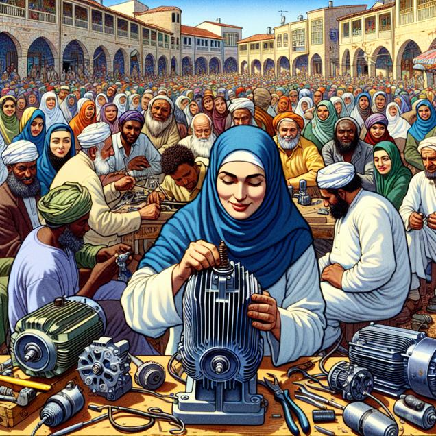 Prompt: [ A TIME magazine cover image ] Generate an image of a bustling town square in Georgia, with a group of skilled electric motor repairers at the center of attention. In the foreground, depict Dajah, a friendly and dedicated repairer, intently fixing a motor surrounded by a curious and eager crowd of onlookers. Capture the vibrant energy of the scene as the sound of electric tools fills the air, and showcase the growing popularity of Dajah among the community. The focus should be on the interaction between Dajah and the crowd, portraying a sense of admiration and excitement. The depiction should include only scenes, people, and objects, it should not include text or speech bubbles.