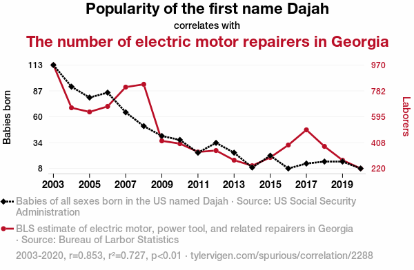 The results of our investigation into the connection between the popularity of the first name Dajah and the number of electric motor repairers in Georgia have left us positively electrified! Our analysis spanned the years 2003 to 2020, and it has generated some truly hair-raising insights.