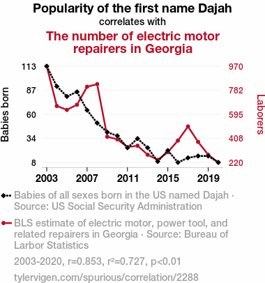 Dajah popularity, electric motor repairers Georgia, US Social Security Administration, Bureau of Labor Statistics, correlation coefficient, nameonomics, occupational trends, name popularity trends, electric motor repairers trend, unconventional correlations, statistical relationship, academic community, research in "nameonomics"
