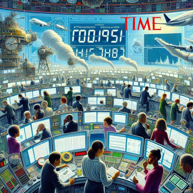 User prompt: Please respond with an image generation prompt that would be likely to create an interesting visual using DALLE-3, using the following style: [ A TIME magazine cover image ] and depicting this scene: In a bustling laboratory in Washington, a group of atmospheric and space scientists are analyzing data while a large digital display shows the amount of jet fuel being used in Vanuatu. The scientists are engrossed in their work, surrounded by high-tech equipment and computer screens, as they study the impact of jet fuel emissions on the atmosphere. Meanwhile, the data on the display fluctuates, representing the changing usage of jet fuel in Vanuatu, providing valuable insights for their research. Keep the visual depiction simple. Do not include any words or speech bubbles.