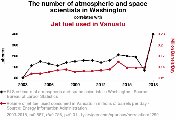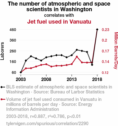 - The spurious research paper: The Sky's the Limit: Exploring the Correlation Between Atmospheric and Space Scientists in Washington and Jet Fuel Consumption in Vanuatu