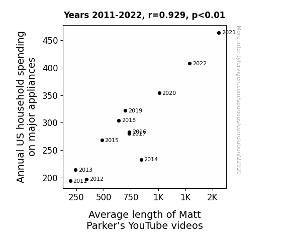 This means 86.4% of the change in the one variable (i.e., Average length of Matt Parker's YouTube videos) is predictable based on the change in the other (i.e., Annual US household spending on major appliances) over the 12 years from 2011 through 2022.