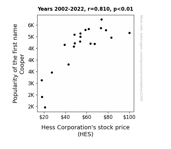 Our study sought to uncover the enigmatic correlation between the popularity of the first name "Cooper" and the stock price of the Hess Corporation (HES). The robust correlation coefficient of 0.8103589 and a p-value of less than 0.01 provided compelling evidence of a substantial and statistically significant relationship. It seems that when it comes to financial markets, the "Cooper" does not merely spoil the broth but catalyzes a bullish run. And speaking of broths, did you hear about the stock market chef? He started the day with a strong stock, but it was a "souper" finish.