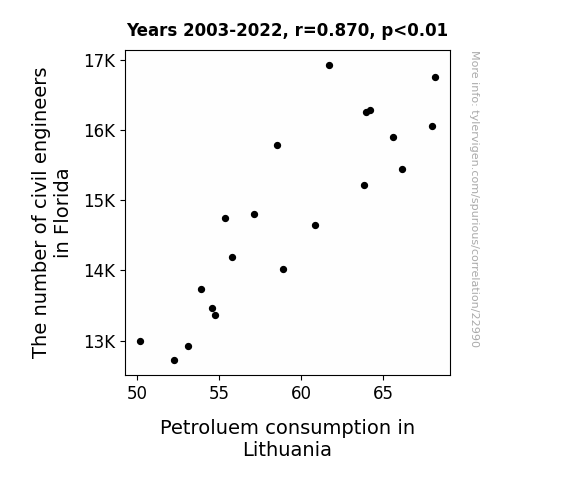 This means 75.7% of the change in the one variable (i.e., Petroluem consumption in Lithuania) is predictable based on the change in the other (i.e., The number of civil engineers in Florida) over the 20 years from 2003 through 2022.