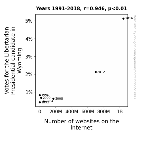 This means 89.6% of the change in the one variable (i.e., Number of websites on the internet) is predictable based on the change in the other (i.e., Votes for the Libertarian Presidential candidate in Wyoming) over the 7 years from 1991 through 2018.