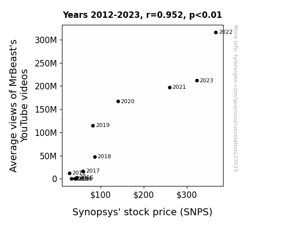 This means 90.6% of the change in the one variable (i.e., Synopsys' stock price (SNPS)) is predictable based on the change in the other (i.e., Average views of MrBeast's YouTube videos) over the 12 years from 2012 through 2023.