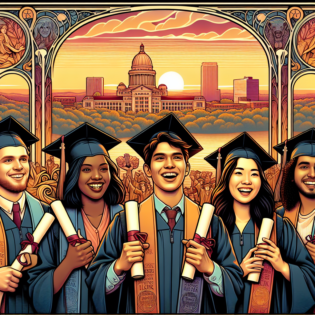 Prompt: Generate an Art Nouveau-style illustration of a serene scene in Little Rock, Arkansas at sunset. In the foreground, depict a group of proud graduates wearing caps and gowns, celebrating their achievement of receiving associate degrees in Education. The graduates should be depicted smiling and holding their diplomas, portrayed in a style reminiscent of classic Art Nouveau motifs. The orange hue cast by the setting sun should be visible in the background, creating a dreamy atmosphere. Add delicate swirls and intricate linework to capture the elegance and flowing forms characteristic of the Art Nouveau style. The depiction should include only scenes, people, and objects, it should not include text or speech bubbles.