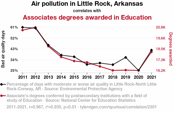 This means 93.5% of the change in the one variable (i.e., Associates degrees awarded in Education) is predictable based on the change in the other (i.e., Air pollution in Little Rock, Arkansas) over the 11 years from 2011 through 2021.