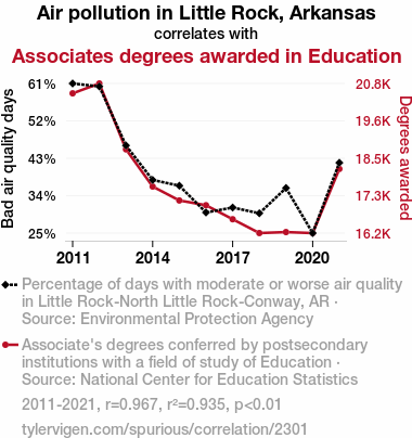 - The spurious research paper: Breathing Easy: An Analysis of the Relationship Between Air Pollution in Little Rock, Arkansas and Associates Degrees Awarded in Education
