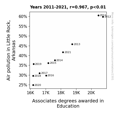 Breathing easy, but sweeping up with the latest data, our study investigates the surprising link between air pollution in Little Rock, Arkansas, and the awarding of associate's degrees in education. Our research team delved into the data from the Environmental Protection Agency and the National Center for Education Statistics to tackle this seemingly far-fetched connection. With a correlation coefficient of 0.9671025 and a p-value of less than 0.01 for the time period spanning from 2011 to 2021, our findings present a compelling case for further investigation. It seems the air in Little Rock isn't the only thing that's heating up - the pursuit of education appears to be influenced by the air quality in this southern city!