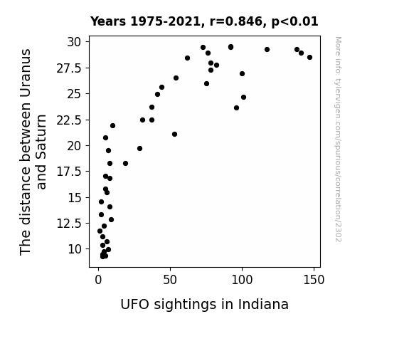This means 71.6% of the change in the one variable (i.e., UFO sightings in Indiana) is predictable based on the change in the other (i.e., The distance between Uranus and Saturn) over the 47 years from 1975 through 2021.