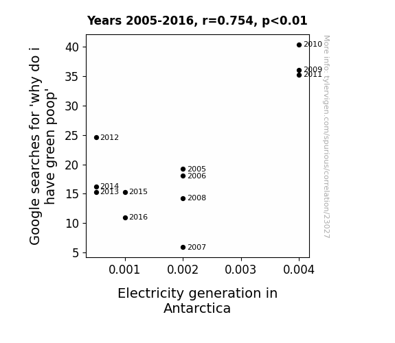 This means 56.9% of the change in the one variable (i.e., Electricity generation in Antarctica) is predictable based on the change in the other (i.e., Google searches for 'why do i have green poop') over the 12 years from 2005 through 2016.