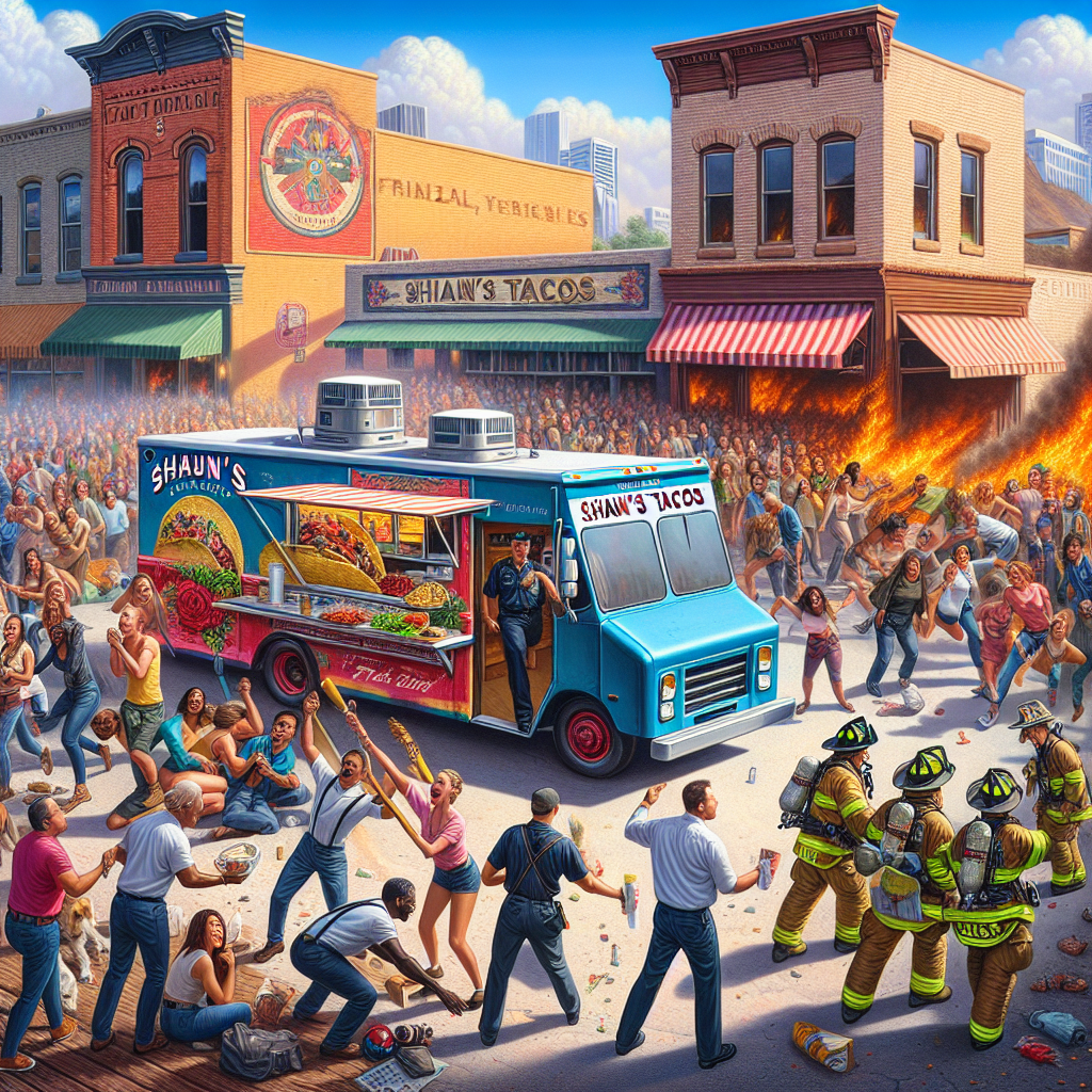 ChatGPT: Create an image of a vibrant Arizona town scene with a focus on "Shaun's Tacos" food truck as the central point of interest. The bustling atmosphere should feature colorful characters gathered around the food truck, with anticipation and enthusiasm evident on their faces. In the background, show firefighters swiftly handling a small fire set by an arsonist, emphasizing the sense of urgency and action. The scene should be visually captivating, capturing the contrasting energy of enjoyment and urgency present in the Arizona town.