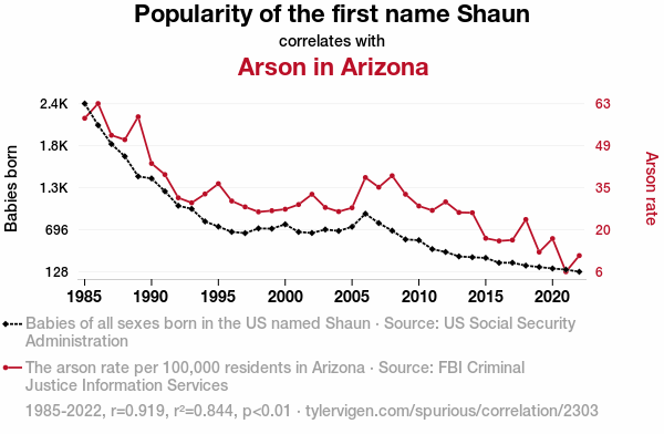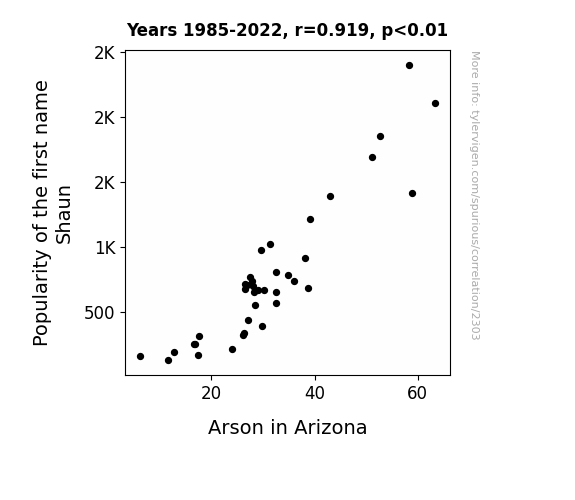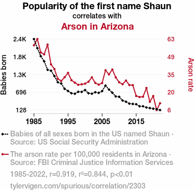 User prompt: Please provide potential search keywords for a paper titled Playing with Fire: The Shaun-arson Connection in Arizona with an abstract of This study aims to investigate the potential relationship between the popularity of the first name "Shaun" and the incidence of arson in the state of Arizona. Drawing from data provided by the US Social Security Administration and the FBI Criminal Justice Information Services, our research team conducted a thorough analysis covering the years 1985 to 2022. Our findings revealed a remarkably high correlation coefficient of 0.9189290, with statistical significance at p < 0.01, suggesting a strong association between the prevalence of the name "Shaun" and arson occurrences in the state. While the exact mechanisms underlying this association remain elusive, the results impart a newfound appreciation for the impact of nomenclature on delinquent behavior. Our study underscores the importance of considering unconventional factors in the investigation of criminal activities and sparks further scholarly inquiry into the peculiar interplay between nomenclature and unlawful conduct.