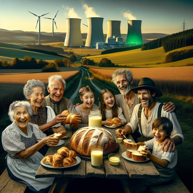 Prompt: Prompt: Generate an image that shows a quaint, scenic countryside in Slovakia. In the foreground, a charming family sits at a wooden picnic table, surrounded by rolling green hills. The family is happily savoring fresh, piping hot bread spread with creamy butter. Their rosy cheeks and smiles convey warmth and contentment. In the distance, a picturesque power plant harmoniously fits into the landscape, subtly hinting at its role in providing clean, renewable energy. The plant is connected to the environment, emitting a soft, greenish glow, symbolizing sustainability and progress. The overall scene exudes a sense of harmony between traditional family values and innovative, eco-friendly technology. The depiction should include only scenes, people, and objects, it should not include text or speech bubbles.