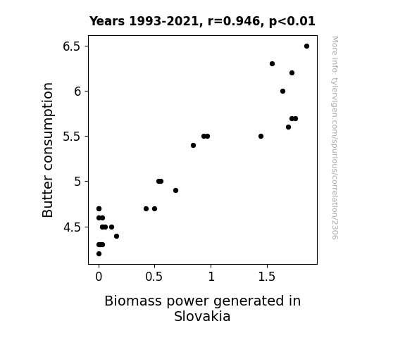 Now, as we wade deeper into the whimsical world of butter and biomass power, let's not forget that while correlations are like butter - they spread, they melt, and sometimes they're just a little too slippery to grasp. But fear not, dear reader, for in uncovering the sizzling connection between butter consumption and biomass power generation in Slovakia, we are poised to churn out a deliciously enlightening revelation, proving that when it comes to energy dynamics, butter truly does make everything better!