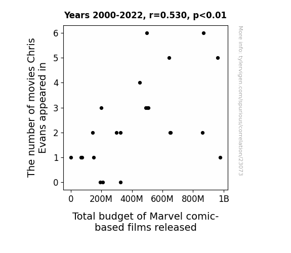 This means 28.1% of the change in the one variable (i.e., Total budget of Marvel comic-based films released) is predictable based on the change in the other (i.e., The number of movies Chris Evans appeared in) over the 23 years from 2000 through 2022.